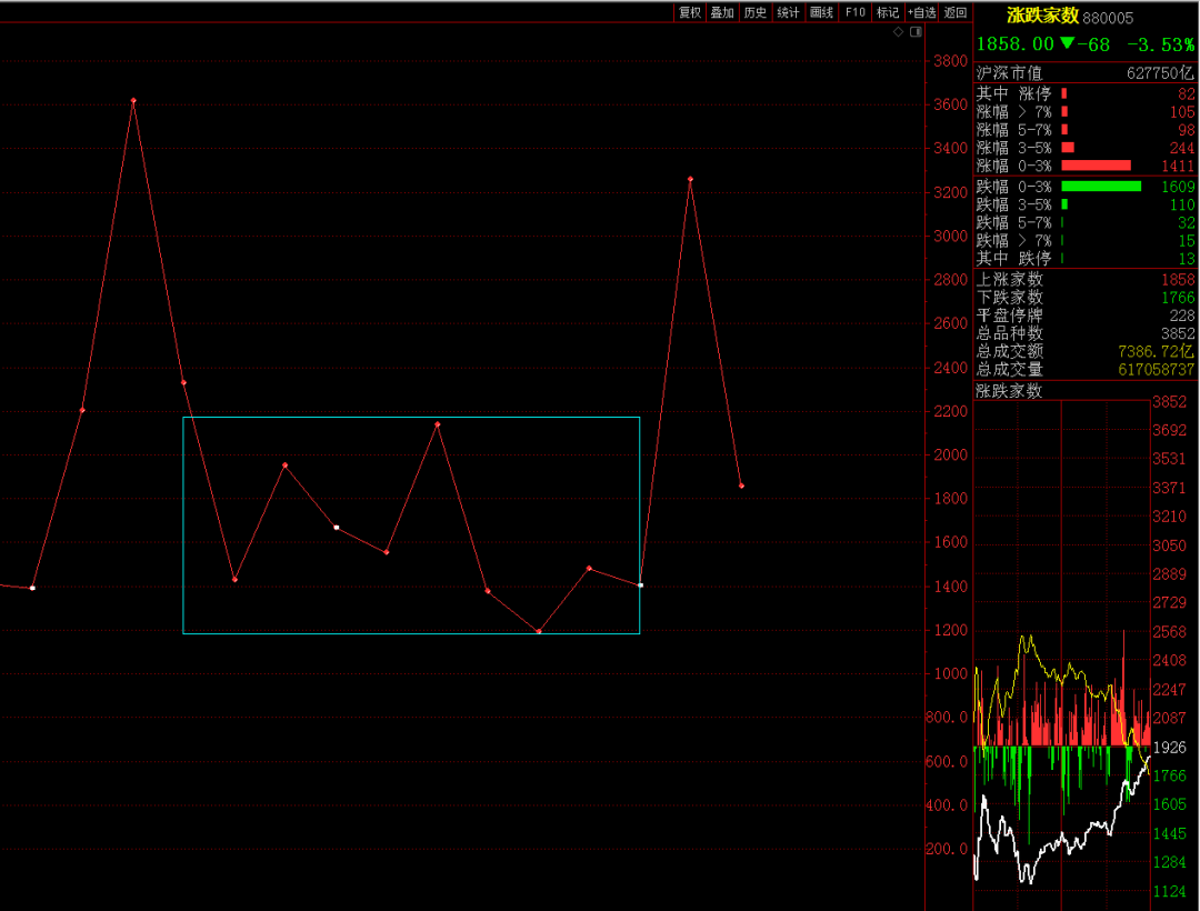 今天的涨跌家数指标再次回到较低位,个股活跃度再次降低。