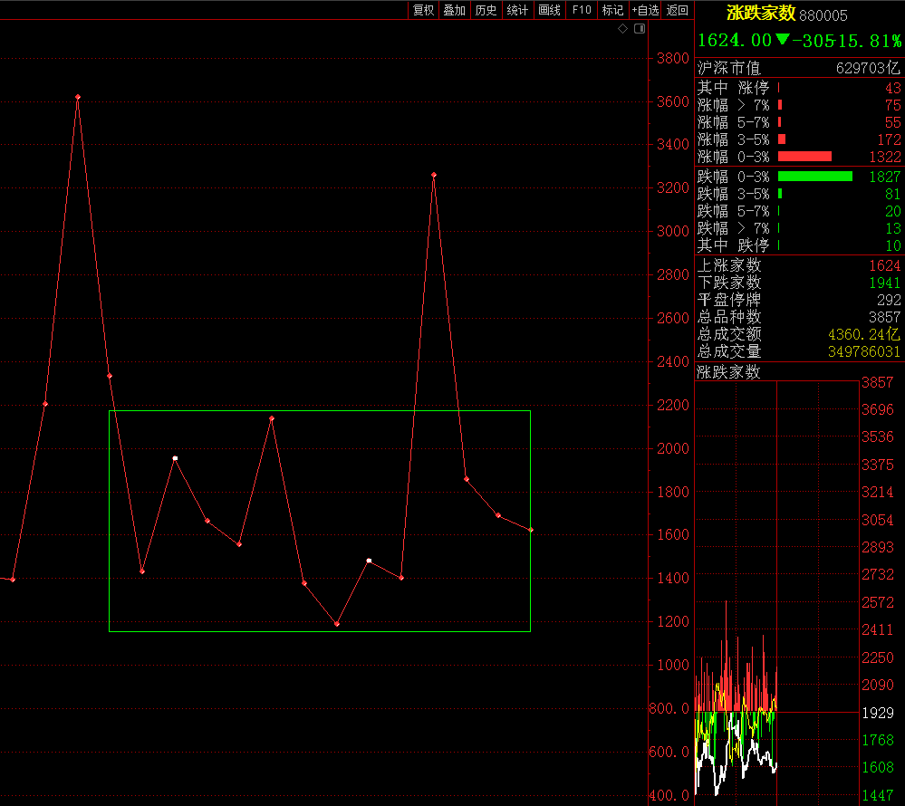 个股的萎靡直接看涨跌家数(880005),个股涨少跌多涨跌比1624:1941,涨停43只,跌停10只。涨跌家数指标还是“趴”在中位偏低——这个现象已经维持了12日。