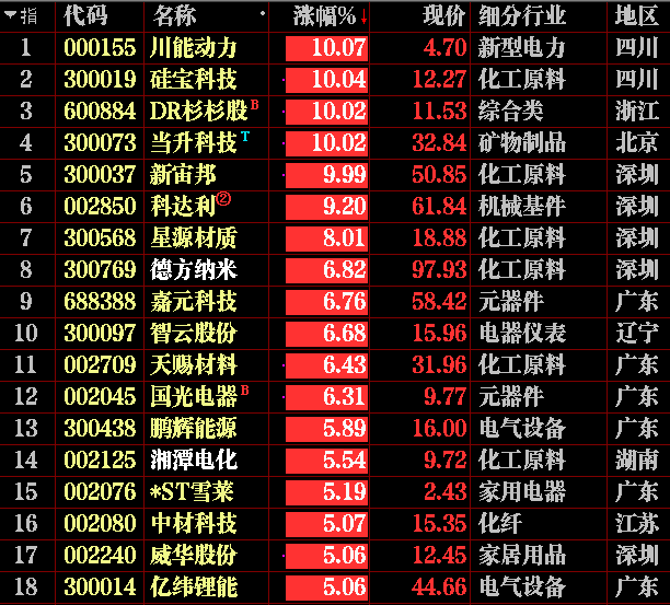 锂电池板块整体表现虽不够强势,但涨速前列个股走势却比较凌厉。如川能动力、硅宝科技强势阳包阴,杉杉股份除权当日就涨停,老牌的当升科技、新迪邦、科达利、星源材质、智云股份、天赐材料、鹏辉能源、湘潭电化等涨幅居前。