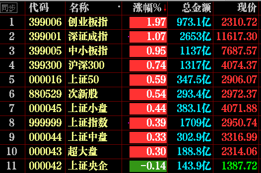 创业板指盘中涨超2%,收涨1.97%,刷新年内高点;深证成指、中小板指涨幅居前。沪指整体弱势,上证央企微绿。
