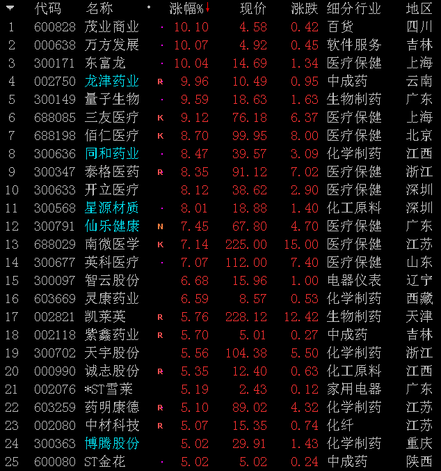 大医药医疗板块个股上午收涨4%以上40只,其中6只涨停。