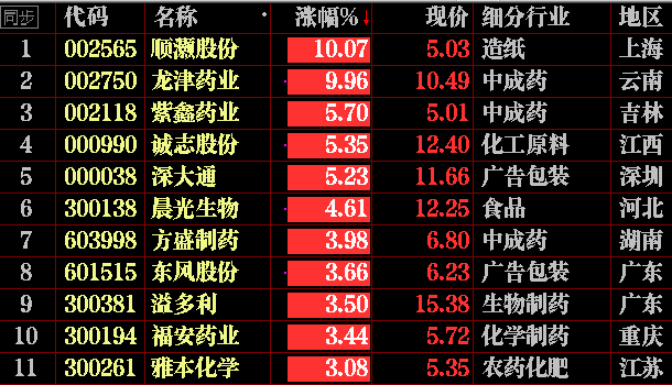 趴在底部、趋势已修复的还有:紫鑫药业(002118)、诚志股份(000990)、方盛制药(603998)、东风股份(601515)、福安药业(300194)、跨境通(002640)等。