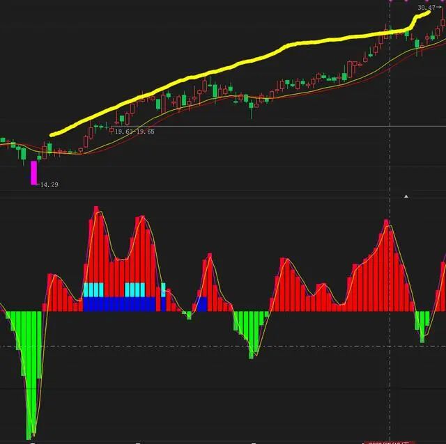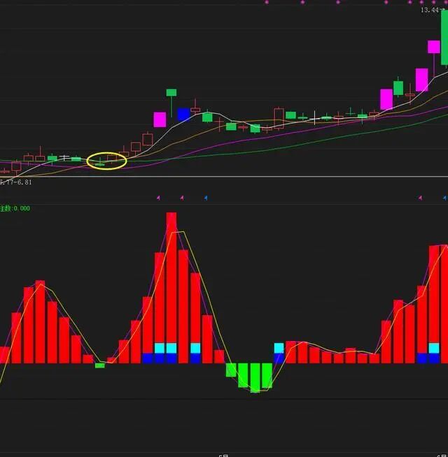 “海底捞月”也是主力常常利用利空消息来洗盘的手段,那么可在当日收盘前可介入,越低开,拉升的高,那么短线成功率越高。 主力利用消息面的利空,扫走胆小散户手中的筹码。低位入货,顺带洗盘。 市场成本差不多:中长期均线能够长时间保持平行移动,说明市场对目前的股价趋于认同,同时也封闭了股价在短期内的下跌空间。 不远处作半弧圆:13日均线弱势下叉中长期均线并在其不远处作半弧状运动,显示上方抛压并不沉重,暗示回档幅度不会太深。 均线多头有望成:13日均线重新上穿55日均线,表明有新的资金进场,均线系统可望迅速构成多头排列状态,从而支持股价继续上行。 一阳穿多线 股价经过长期下跌和充分整理之后,均线系统的下跌斜率开始趋缓,并逐渐向一起靠拢,股价波幅日益收窄。在某一天,突然一根放量阳线向上同时突破5天、10天、30天均线,且收盘在30天均线上方。 这种情形大有过五关斩六将的气概,是典型的上升信号。这是庄家展开大反攻的突出标志,庄家拿出了拼命的架势,做多意图完全暴露。 这根一举穿越三线的K线,称之为“一阳穿三线”。