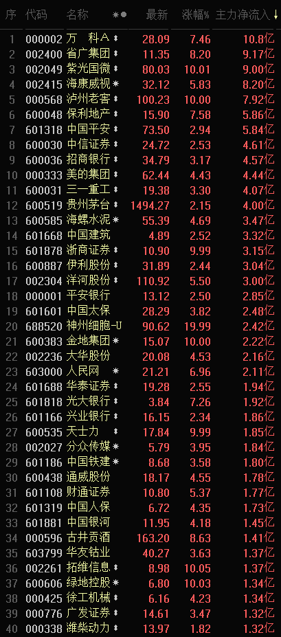 主力资金净流入板块也集中在大盘股和权重股,包括房地产、酿酒、券商信托、银行、保险、水泥建材、工程建设、有色金属、家电等。