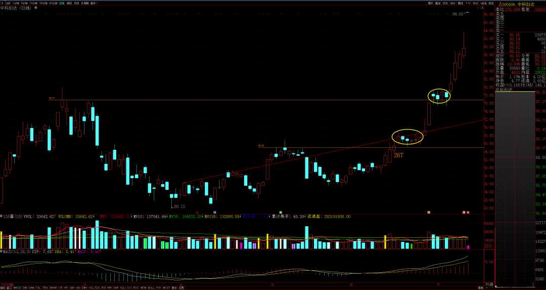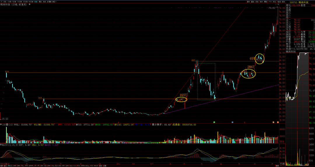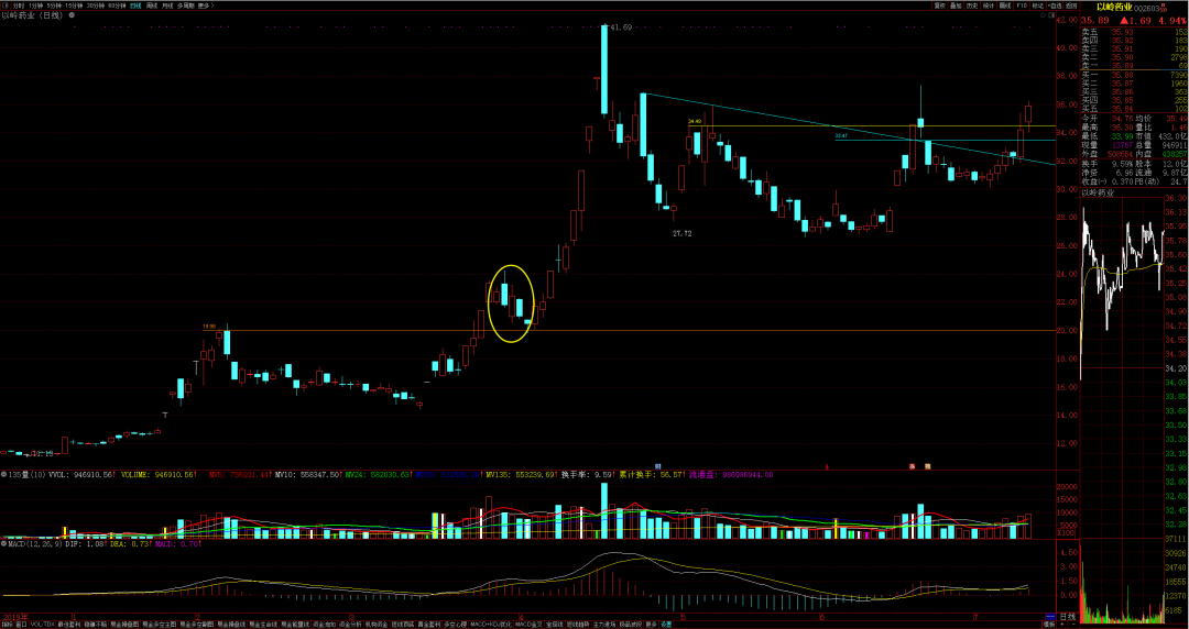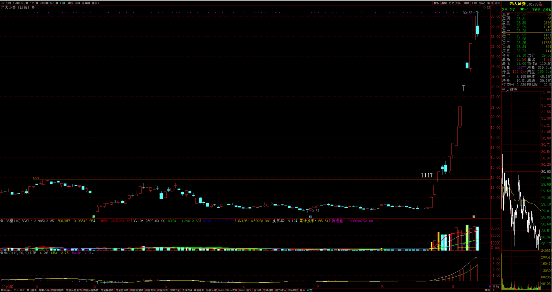 光大证券(601788)6月23日三连板突破前高后,两根高开低走伴随放量阴线震荡,一般很难判定它已震荡结束——之前好多股票三板后大跌,止跌后再回眸一笑大涨,它之后8天7板,涨势非常凌厉!