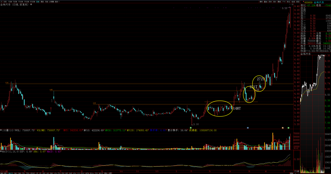 金杯汽车(600609)的突破则是反复拉升和洗盘,长区间跨度突破后,大多头趋势形成,涨停+大阳加速大涨。