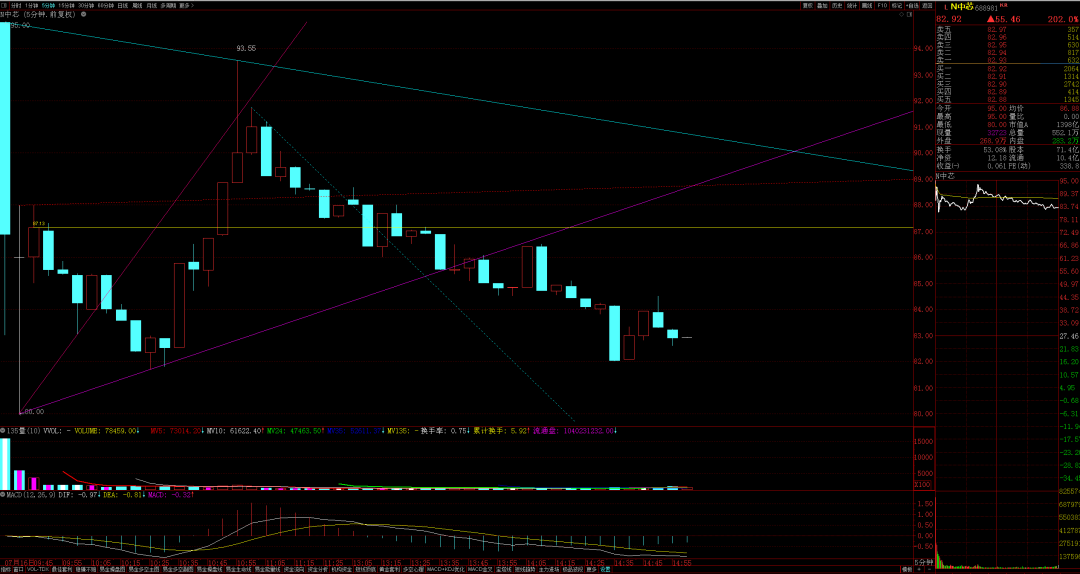 午间,画出了5分钟K线图分析,建议卖出:(上午收盘价87.98元) 收盘的5分钟K线图:(下午最低价82.00元,收盘82.92元)