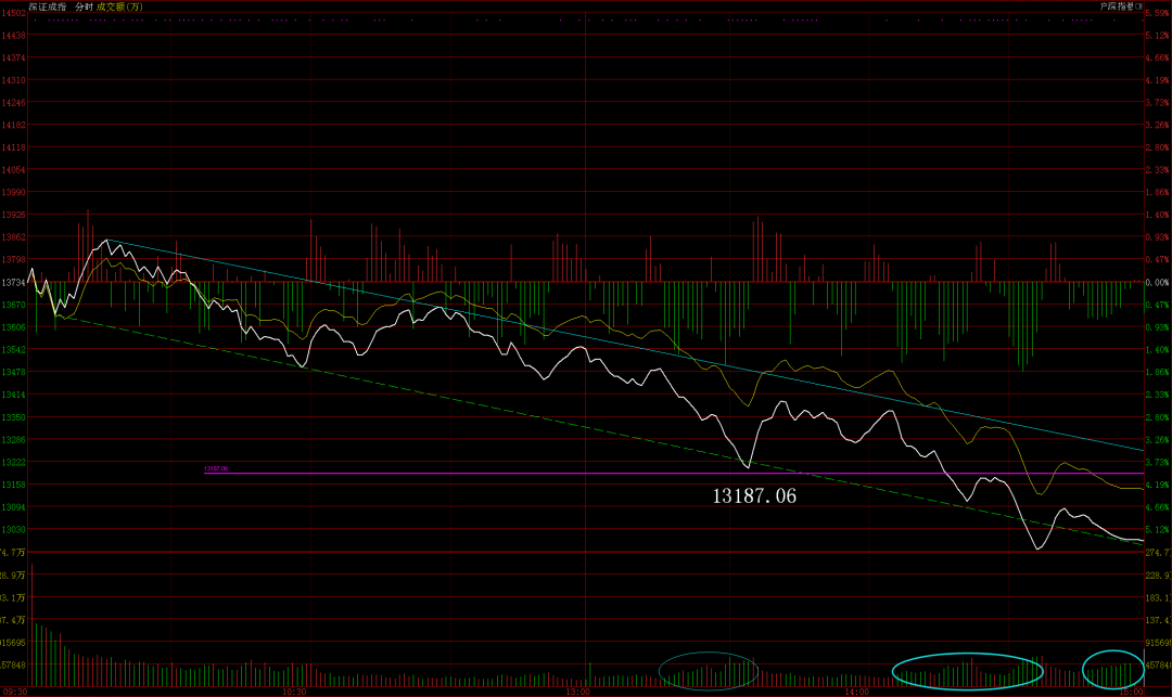 深指在前高13187.06点上方有所支撑,但同样被跌漏,也同样在跌漏后放大了卖盘,直至收盘。