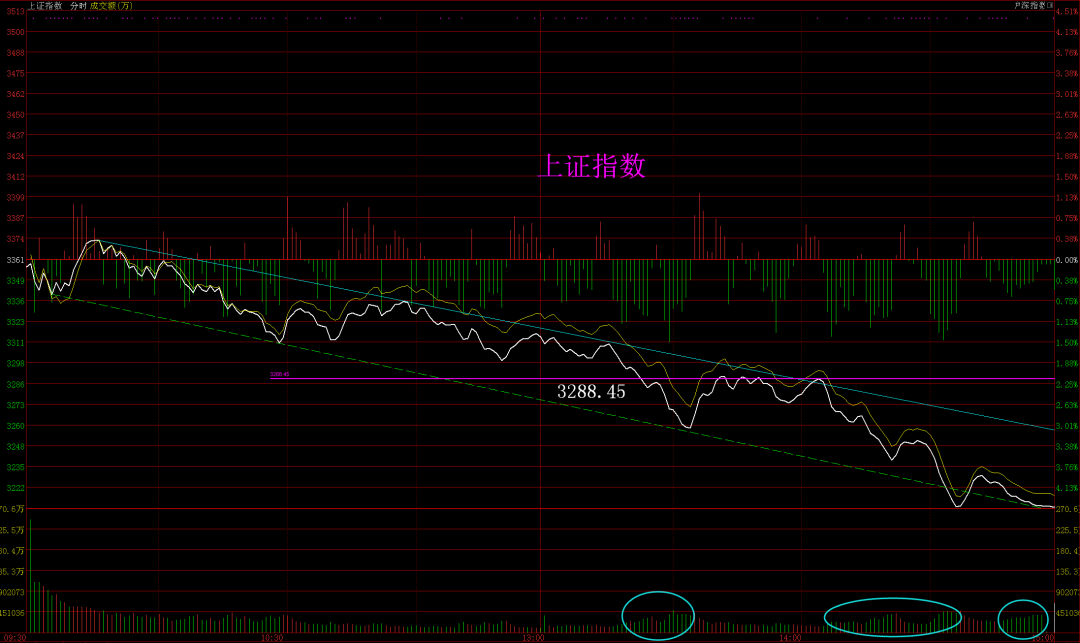 (四)盘中涌出恐慌盘。指数分时运行“遵循”下跌通道趋势往下,每一次下跌都伴随大卖盘涌出,而且逐波放大,明显是恐慌杀跌盘“缴械”。