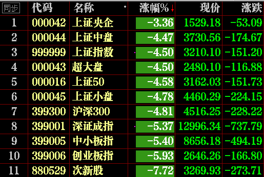 (一)各主要指数集体暴跌。次新股最大跌幅7.72%,上证央企最小跌幅3.36%,上证指数跌4.5%,深证成指跌5.37%。