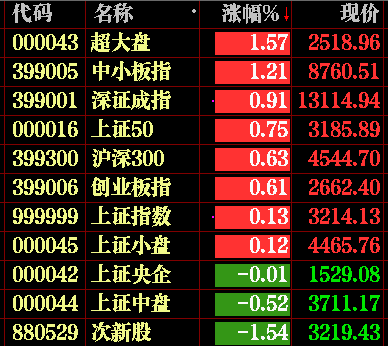 全天各主要指数有涨有跌,四大指数均收涨,超大盘收涨1.57%、中小板指收涨1.21%,次新股收跌1.54%。