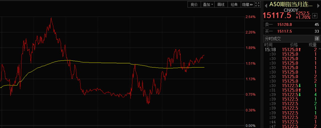 对A股影响较大的A50期指昨晚依托MA20展开了小反弹,今天白天依然震荡幅度较大,盘中最大涨幅2.64%,回落时最小涨幅0.5%左右,但大多数时间都在昨晚分时均价线之上运行。15:20时,它还有超过1.7%的反弹幅度。