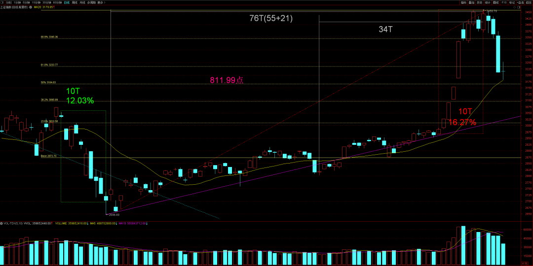 其次,本轮缓涨到急涨的分位支撑。6月12日确认6月1日跳空缺口后的缓涨到急涨到见顶历时20个交易日,可算一个完整的周期。以此阶段最低到最高点画黄金分割,50%分位是3165点,61.8%分位是3234点,这个区间大致是今天的震荡范围。后市两天指数点位不再创新低、最好能站上61.8%分位,且伴随成交量的再次放大,那么黄金分割分位支撑有效,MA20也就能形成有效支撑。