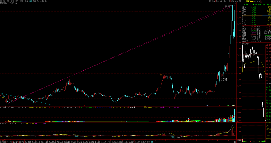 借助免税店概念大涨的鄂武商A,回顾画线分析,在实现2018年即“预定”的股价目标后大跌再反抽一字涨停板,今天几乎天地板。其实,在7月13日开盘即最高价25.00元即明示顶部。