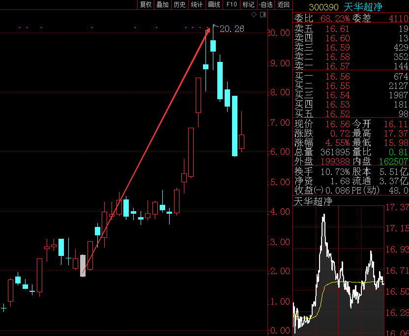 天华超净(300390):6月15日—7月13日19个交易日涨56%,其中3个涨停板。