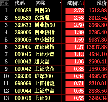 上午指数的走势,快速冲高,加速回落,缓步上行,指数全涨。 高层会议昨天再次定调资本市场,这是重大利好!也是早盘快速拉升的主要刺激因素。 加速回落,一是下探支撑,二是等5日线上行。无论怎样的政策面消息,总是要服从技术面——市场合力的结果。指数周三大涨、昨天回调,依然偏离了短期均线,所以,必须“等”5日均线上行,才靠谱。 经过昨天和今天上午的震荡后,目前各主要指数的MA5已经上拐,加上MA10,共同对指数形成短期支撑,后市维持成交量持续放大(最好不要突然爆量),缓慢上行,则是理想与现实相结合的健康平稳的“慢牛”趋势。 科创50很扎实地大涨了2.73%,次新股相应大涨2.58%,创业板50不甘示弱地上涨2.5%带动创业板指收涨1.89%,而作为大盘股代表的上证50殿后收涨0.55%。