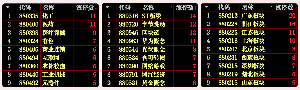热点还是看涨停数排序:行业集中在化工、医药、医疗等,概念集中在字节跳动、区块链、华为等,地区集中在广东、浙江、江苏、上海等。