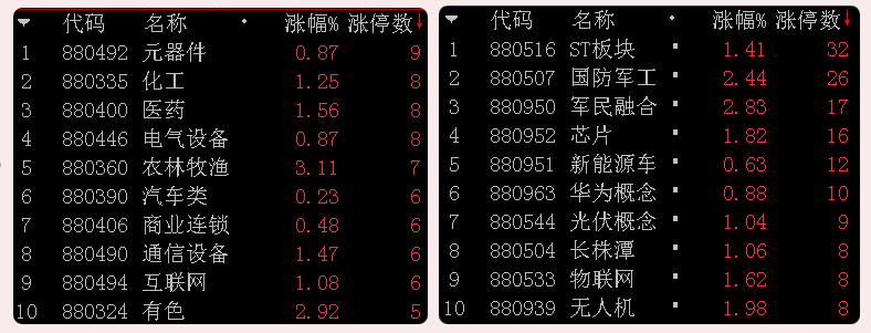 受政策利好刺激,开盘时半导体、芯片大幅高开,到收盘时已经是另外一幅景象。比较开盘、收盘行业、概念板块指数的分别前7、10: