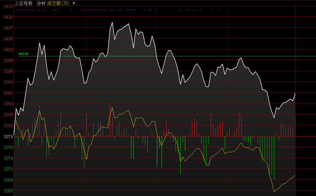 上证指数最高点3409.06点,总算是再摸3400整数关口。分时看,5次上3400点都被砸了下来,11点钟后再上已经无力,而快速跳水,关口的压力还是比较大。