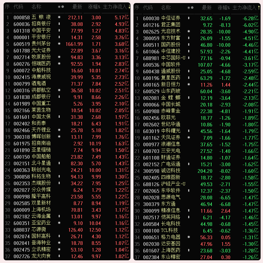 主力资金出多进少: 个股方面,主力资金净流入超亿元37只,大多是权重股;净流出超亿元52只。 上午主要热点依然是军工和国企改革: