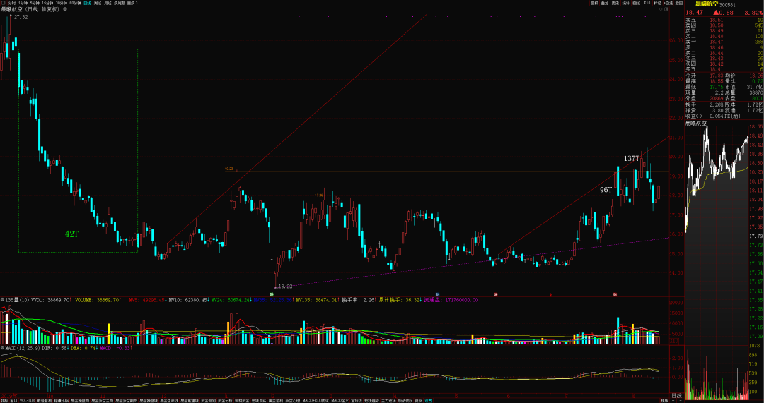 晨曦航空(300581)公司是国内少数同时拥有航空技术信息化中最关键的导航、控制、通讯(航空)计算机等核心技术的企业;是A股中为数不多以纯军品为主营的民参军企业,公司的主要产品主要航空惯性导航、航空发动机电子及无人机三大领域,都是高附加值、高技术壁垒的惯性导航、航空发动机电子系统等领域;公司的产品主要给直升机以及新型号配套(直升机需求为航空装备中最大)且航空发动机是我国目前亟待突破的领域,公司成长空间很大。公司立足于航空领域,主营业务为研发、生产、销售航空机电产品及提供相关专业技术服务,主要产品及服务涉及航空惯性导航、航空发动机电子及无人机领域。公司主要产品均为军民两用产品,现阶段公司产品主要以军品形式销售,终用户主要为国内军方。 叠加卫星导航、无人机概念,有定增预案。 7月24日跳空涨停突破96个交易日前高点后持续震荡消化前期被套筹码,并在突破位获得支撑。