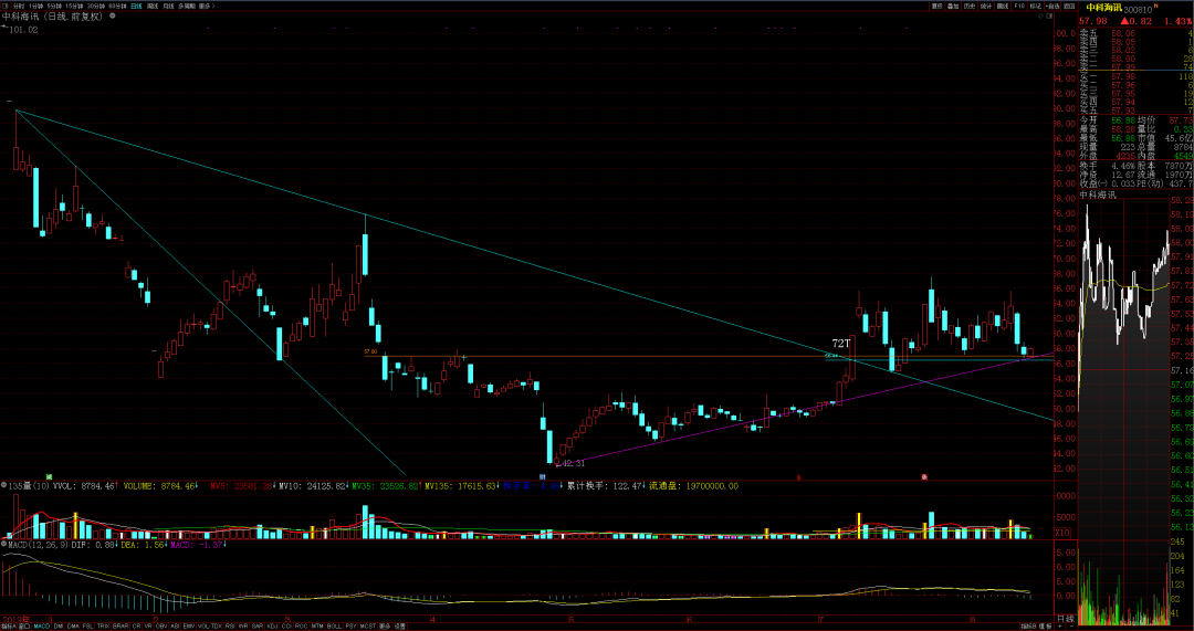 中科海讯(300810),次新股。公司主要为客户提供信号处理平台、声纳系统、水声大数据与仿真系统、无人探测系统等声纳领域相关产品;公司主要作为军工企业的核心配套单位,主要产品是生产作为声纳整机的核心配套产品信号处理平台。 叠加国产软件、大数据概念。 7月8日涨停突破72个交易日平台后反复震荡消化3月20日之前的被套筹码,8月14日在支撑位获得支撑,形成地量止跌信号,与7月17日相隔21个交易日,符合周期规律。