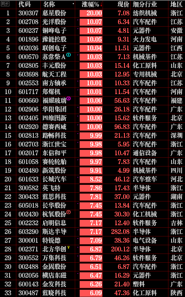 非ST超跌反弹涨停个股18只:慈星股份、光洋股份、铜峰电子、川仪股份、联创电子、嘉凯城、星期六、亚夏股份、荣丰控股、三人行、四维图新、路畅科技、宜宾纸业、鲁商发展、力鼎光电、东信和平、艾格拉斯、新筑股份。