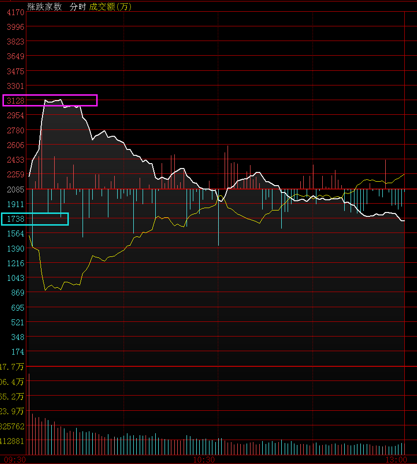 涨跌家数显示,开盘后不久最高有超过3100只个股上涨,之后的减少速率可算是单边下跌,上午收盘仅有1711只收涨,其中涨停51只,下跌2257只,其中跌停19只。