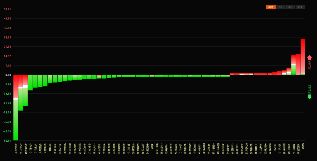 主力资金上午主要流向银行、医药医疗、酿酒,主要流出电子元件、汽车、有色、化工、机械。