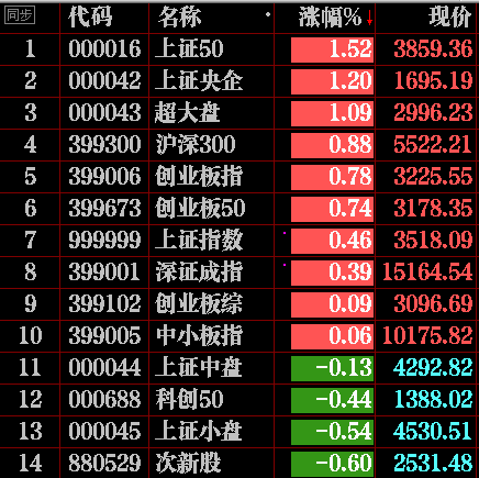 主要观察指数涨幅榜上,上证50、上证央企、超大盘都收涨超过1%,四大指数均收涨,个股涨势仅仅在开盘后15分钟昙花一现,之后上涨个股逐步减少,这与银行股大涨有密切关系。