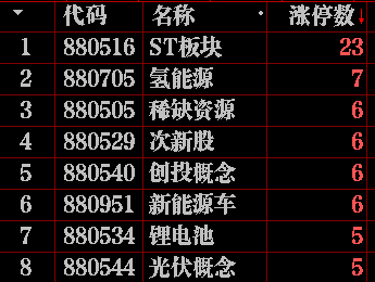 涨停数排序前8概念板块:ST板块、氢能源、稀缺资源、次新股、创投概念、新能源车、锂电池、光伏概念。