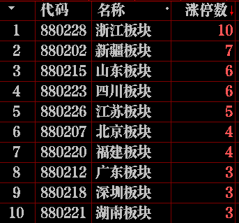 浙江是唯一10只涨停地区,其他地区都有少数分布:
