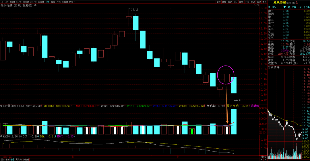 抱团股仅有紫金矿业涨停,成交量明显放大;华东医药封板被砸,爱尔眼科、山西汾酒、泸州老窖、泰格医药、五粮液、片仔癀、隆基股份、通威股份等一批个股冲高回落源于成交量的不足。底部缺量,不但难以延续反弹,反而可能再跌,分众传媒是经典走势,昨天调控反弹5.05%,成交量15.5亿元低于前期下跌阶段日均19亿元,今天低开低走再创新低,收跌7.16%。