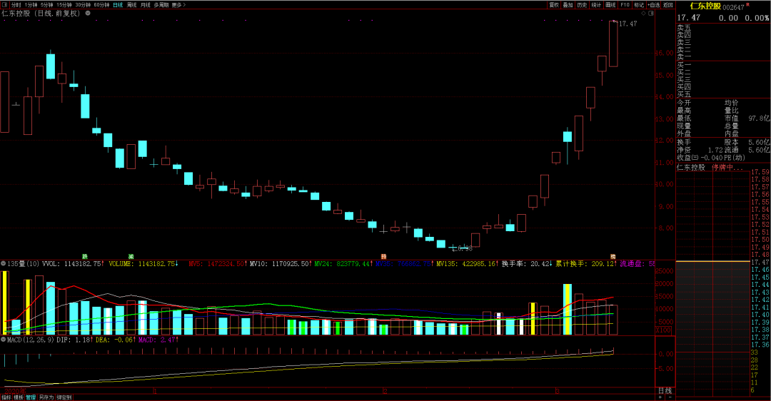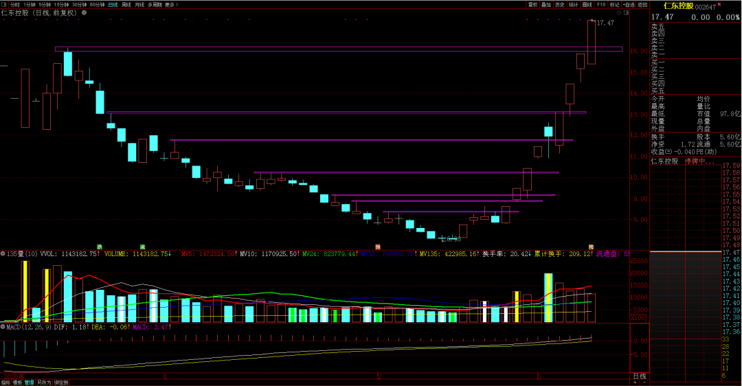 仁东控股持续放量突破左侧每一个前高,9个涨停板被停牌核查,技术上在后4个涨停板已经连续缩量推升,很可能弱不停牌,在第10个涨停板会巨量震荡见顶。