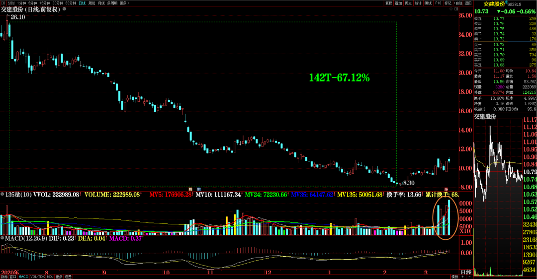 在2020年8月6日到2021年1月5日102个交易日期间,成交量13.5亿元,日均成交量1323.5亿元,累计换手74.82%,平均换手仅有0.73%,成交非常低迷。
