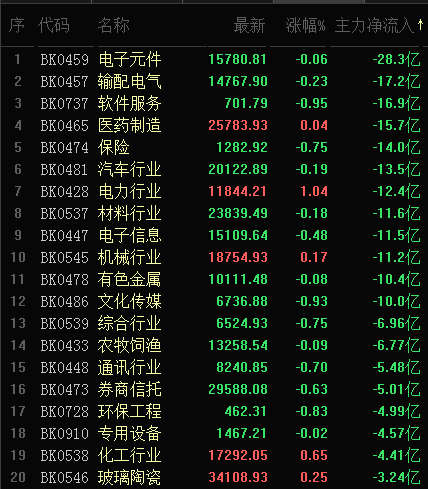行业板块净流出46个,其中2亿元以上28个,电子元件、输配电气、软件服务、医药、保险、汽车、电力、材料等12个行业板块主力资金净流出10亿元以上。
