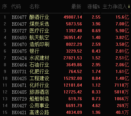 东方财富的行业板块净流入15个,酿酒、煤炭、医疗、航天航空、造纸、银行、水泥、石油等板块净流入2亿元以上,酿酒居首为15.6亿元。