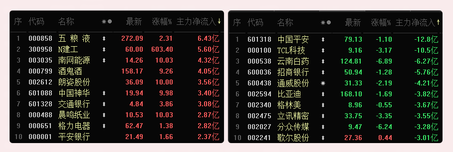 主力资金净流入超亿元个股27只,五粮液、N建工、南网能源、酒鬼酒等4只净流入超4亿元;主力资金净流出超亿元个股59只, CHN平安、TCL科技、云南白药、招商银行、通威股份等5只净流出超4亿元。