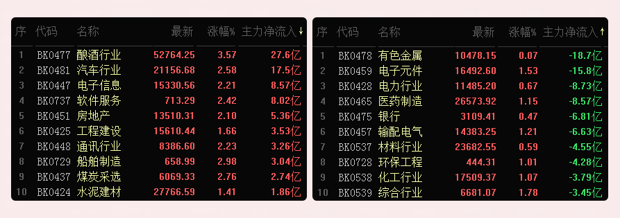 东方财富L2数据显示,主力资金净流入行业板块29个,其中超亿元18个,前五:酿酒、汽车、电子信息、软件服务、房地产,后三个板块处于低位已有较长时间,表明主力资金已经偏好于低位板块。主力资金净流出32个行业板块,其中超亿元22个,前五:有色金属、电子元件、电力、医药、银行,有色金属昨天主力资金流入较多,今天就有大幅流出,炒短行为明显。