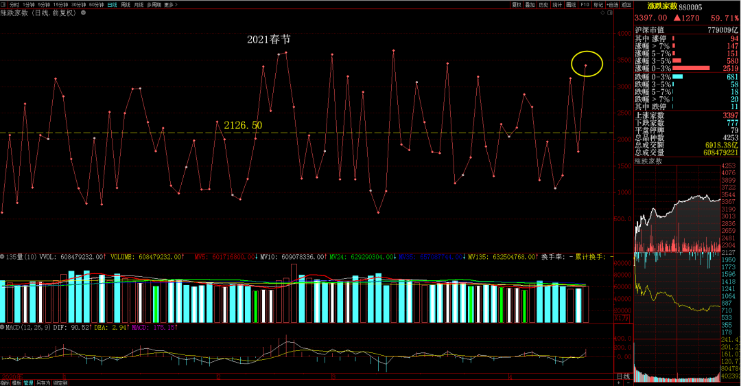 个股普涨,涨跌家数指标上行到高位,下周一个股分化与调整势在必然。