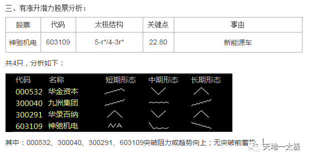 1.300指数 全日运行2波五分钟级别爻行情,日K线为高开长下影小阳线,日、周级别走势向上。 第二级别太极核[5172,5183]不变,全日无买卖信号。 2.创业板指数 日、周级别走势向上,市场结构的演变方式为:6-5r*/5-7r*/4-7r*(t)(=3r*)/3-4y*/2-4r*. 3.中小板指数 日、周级别走势向上,市场结构的演变方式为:6-3r*/5-5r*/4-3r*/3-4y*/2-4r*. 4.上证指数 日、周级别走势向上,市场结构的演变方式为:6-9r*/5-3r*(t)/4-3r*/3-5r*/2-3r*。年线(MA250)为3340. 三、有涨升潜力股票分析: