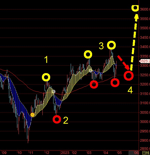 4, 大盘整个4浪的回调和反弹是一个复杂的振荡结构和振荡行情, 趋势交易系统可能会在振荡过程中产生亏损, 而抄底逃顶的逆势交易系统可能在振荡过程中表现得更好一些;目前来看, 4浪回调的第一个底在3229点产生了, 5月21日周一左右出现的下一个重要底可以在3229点之上, 也可以在3229点之下;